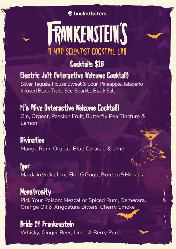 - Monster Mash Halloween Party: $29.88 per person (including fees) - Includes: 1 Interactive Welcome Cocktail + 1 Shot + The chance to enter the costume contest