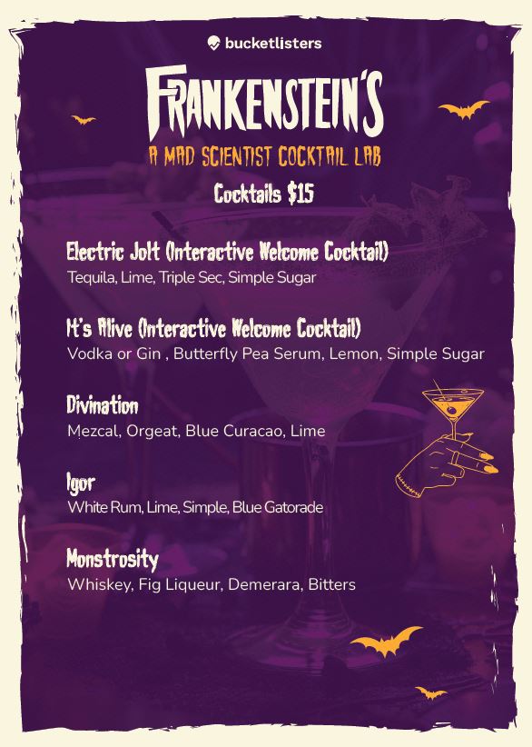 - Monster Mash Halloween Party: $29.88 per person (including fees) - Includes: 1 Interactive Welcome Cocktail + 1 Shot + The chance to enter the costume contest