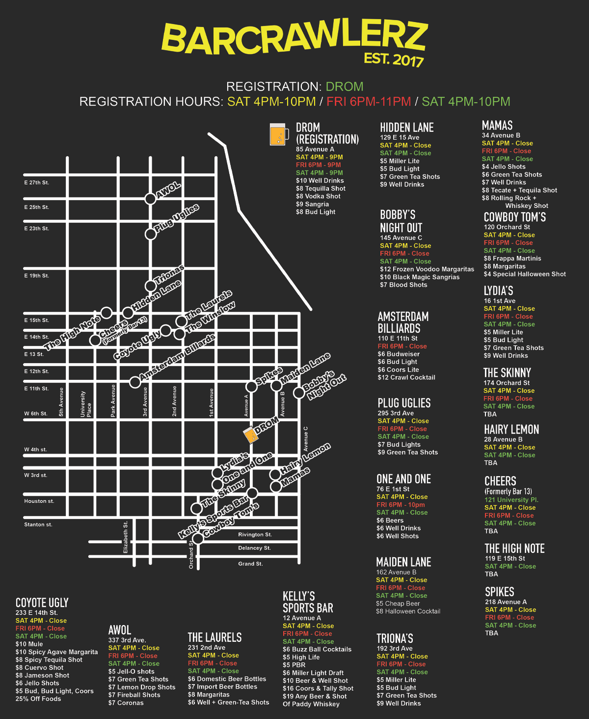 2) Check in at DROM (85 Avenue A, NYC) to get your wristband and map with participating bars, their location, and their drink specials. (Registration on Saturday 10/25 is from 4:00 PM - 10:00 PM, Friday 10/31 is from 6:00 PM - 11:00 PM, and Saturday 11/1 is from 4:00 PM - 10:00 PM) ***WRISTBAND MUST BE PICKED UP DURING THESE TIMES***