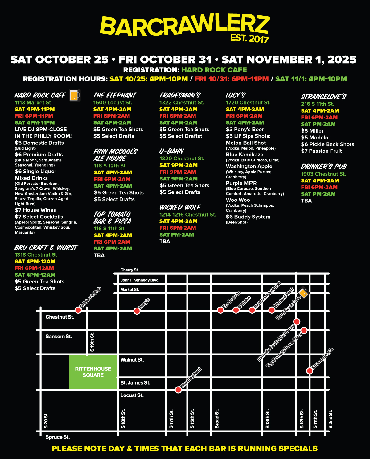 Barcrawlerz is a Philadelphia Bar Crawl like no other. Trick or Drink features The Best Drink Specials and The Best Bars in Town